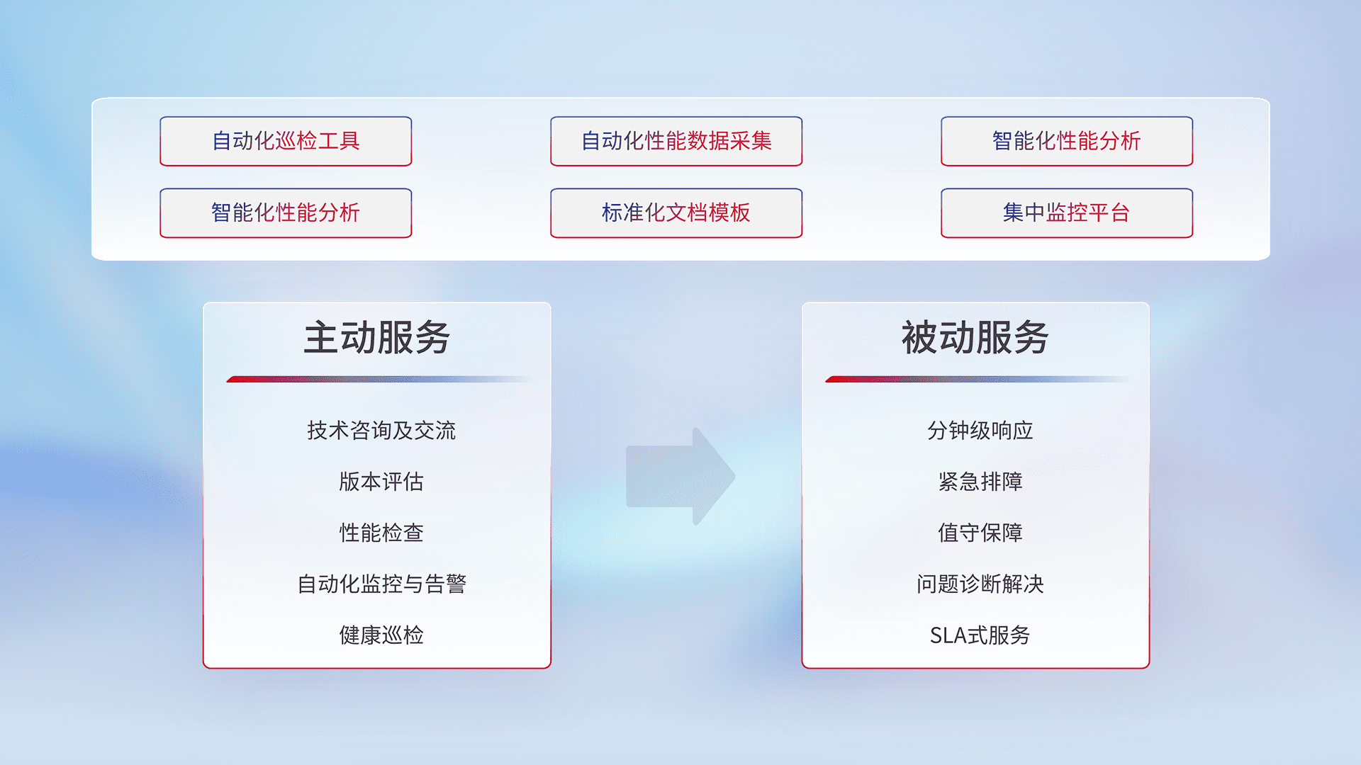 智能化工具和标准化文档,,,,保障服务质量,,,,提供主动服务(包含技术咨询、、、版本评估、、、、性能检查、、自动化监控与告警、、、健康巡检)和被动服务包含(分钟级响应、、、、紧急排障、、值守保障、、、问题诊断解决、、SLA服务)。。